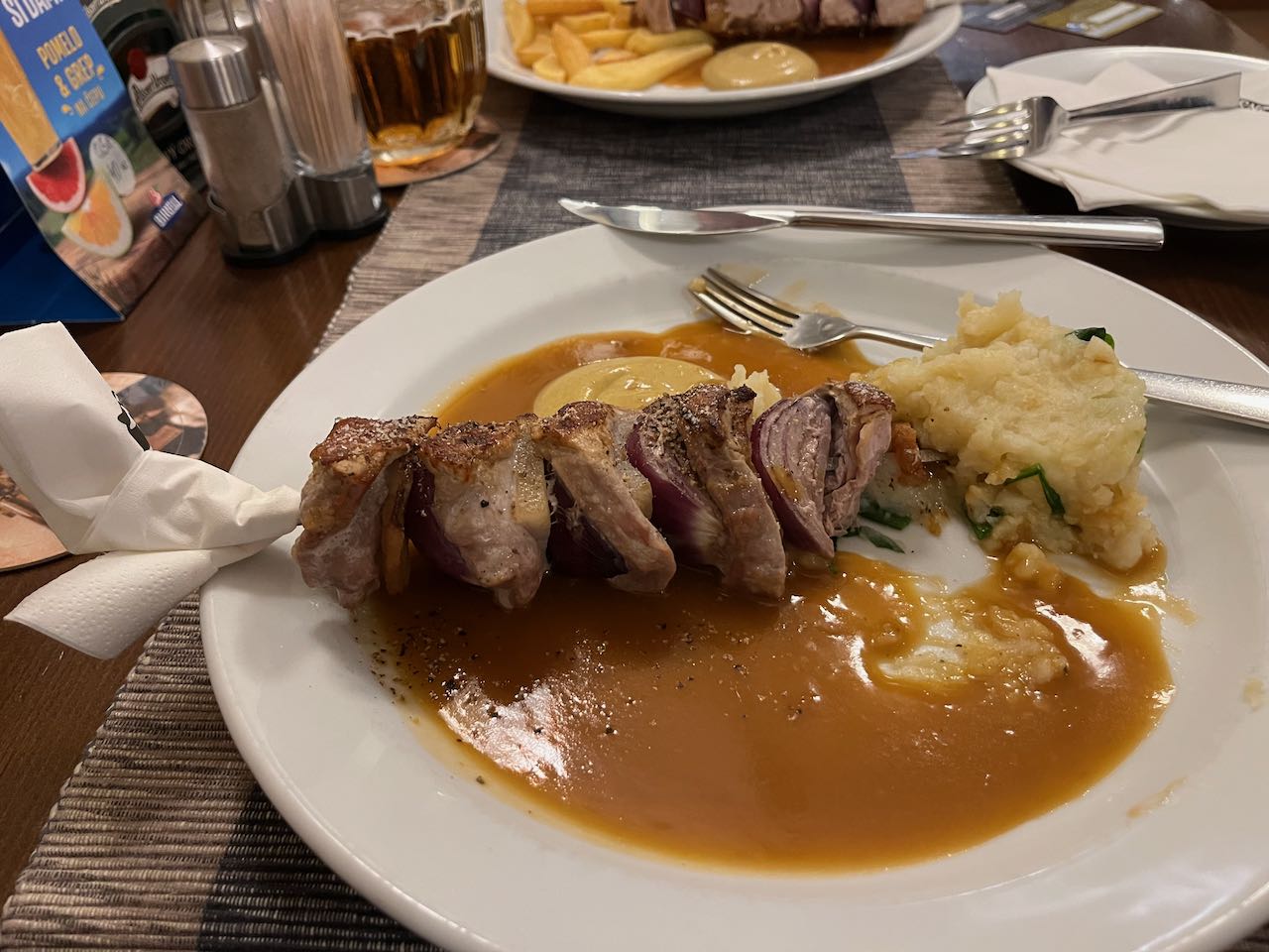 We found a restaurant that was really busy, a good sign. It had advertised itself as Italian but we had a nice warming Czech dinner; I had meaty kebobs with gravy and mashed potatoes and a dollop of dijon mustard.