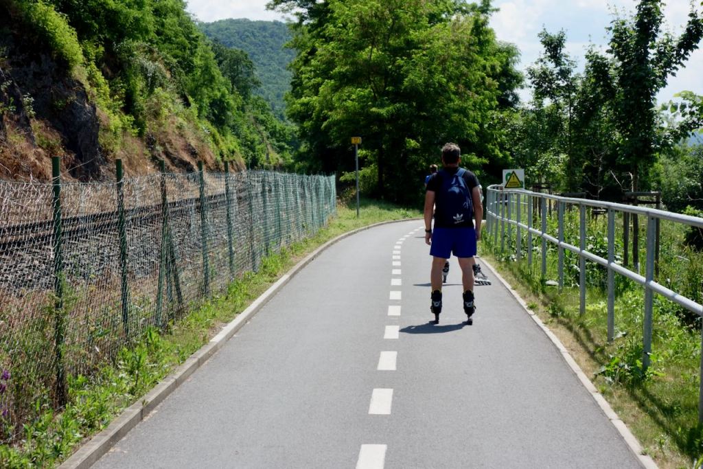 Following the words “mountain bike route” plotted on the website Mapy.cz we were able to get off the busy street and onto a bumpy cobblestone lane that followed directly alongside the river. Within a mile we transitioned to a bike path which then followed the river on the east bank for at least twenty or thirty kilometers south. This path allowed us to leave the city without any further car traffic or even stoplights. For a while the bike path paralleled both the Vltava River and tram tracks.