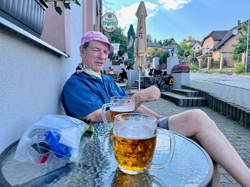 The village of Davle gave us an opportunity to get off the highway. My map showed almost no hotels out here in the Prague exurbs, so there was little incentive to bicycle further. Why not stop now while we were ahead? Utilizing Google maps we had found a place that looked to be both hotel and restaurant. At about five on this Sunday afternoon I walked into the empty main dining room of the Pizzeria Grado Penzion (with its pizza oven) and said (in English) that I wanted two rooms. It took them a couple of minutes to even understand what I was saying, but the guy offered us a special situation, two rooms connected and sharing the same bath, all for about eight-five US dollars total. As we were to find in all of Czechia, everything was clean and modern. It was hot and there was no air conditioning in the rooms, but they cooled off after we opened the windows. The downside was traffic noise from the highway.