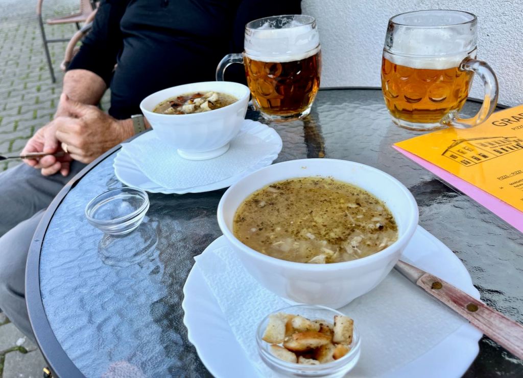 We each regrouped and showered in our rooms and then came back somewhat later to our table on the sidewalk in front of our pizzeria. Soups are the best low cost items at most Czech restaurants, even at one that professed to be Italian. I ate cabbage soup, him minestrone, each for about two or three dollars each. Unlike a low cost place in America each soup came with real chinaware and real cutlery. Each serving was presented with a small cup of croutons. Every soup I ate in Czechia was obviously homemade.