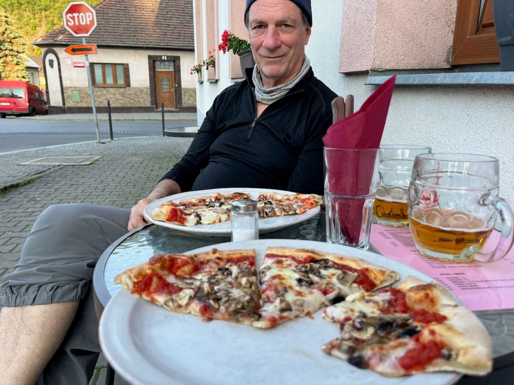 My brother Alex had warned me that the Czechs were not particularly good at cooking non-Czech food, but the pizza we shared as our main course was fine. The restaurant even delivered each pizza half on separate plates. Sitting on a small town Czech street, life was good.