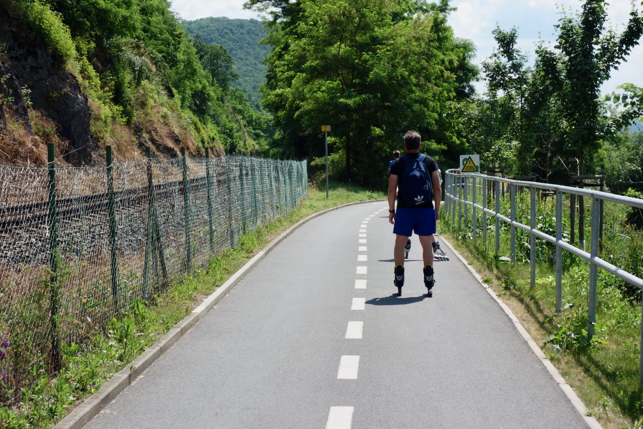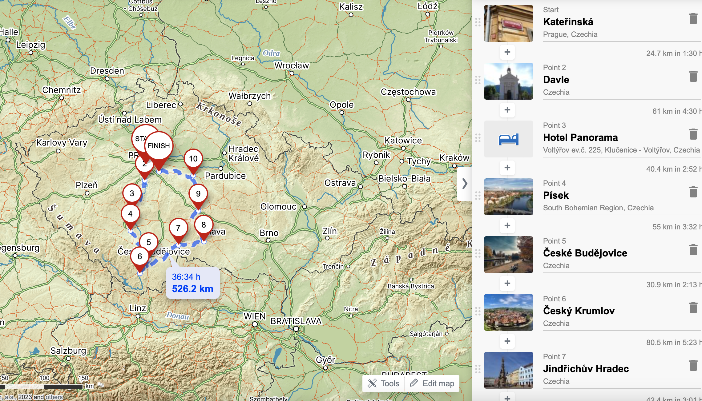 Following the words “mountain bike route” plotted on the website Mapy.cz we were able to get off the busy street and onto a bumpy cobblestone lane that followed directly alongside the river. Within a mile we transitioned to a bike path which then followed the river on the east bank for at least twenty or thirty kilometers south. This path allowed us to leave the city without any further car traffic or even stoplights. For a while the bike path paralleled both the Vltava River and tram tracks.
