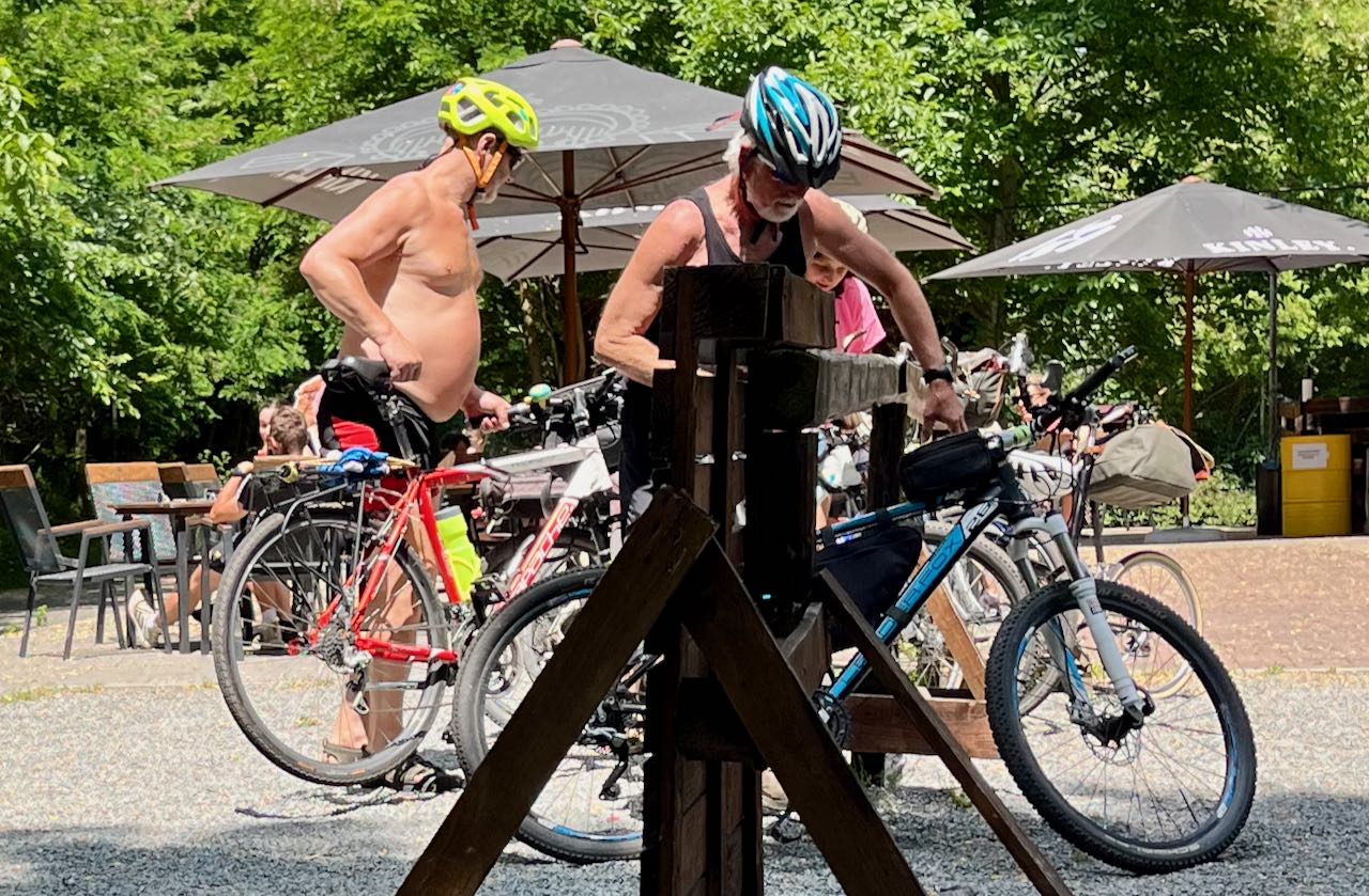 It was only 12:30 PM and we had not cycled all that far but beer and a hot dog seemed appropriate; a beer each and we split one large hot-dog looking thing, the sausage sticking lengthwise out of a French bun. The outdoor tables were all taken so we sat on a nearby stump, enjoyed the people show on this glorious sunny day. One older guy on an electric bike managed to fall over right in front of where we were sitting. We thought he might be really hurt but he slowly got up with assistance from whom was likely his son.
