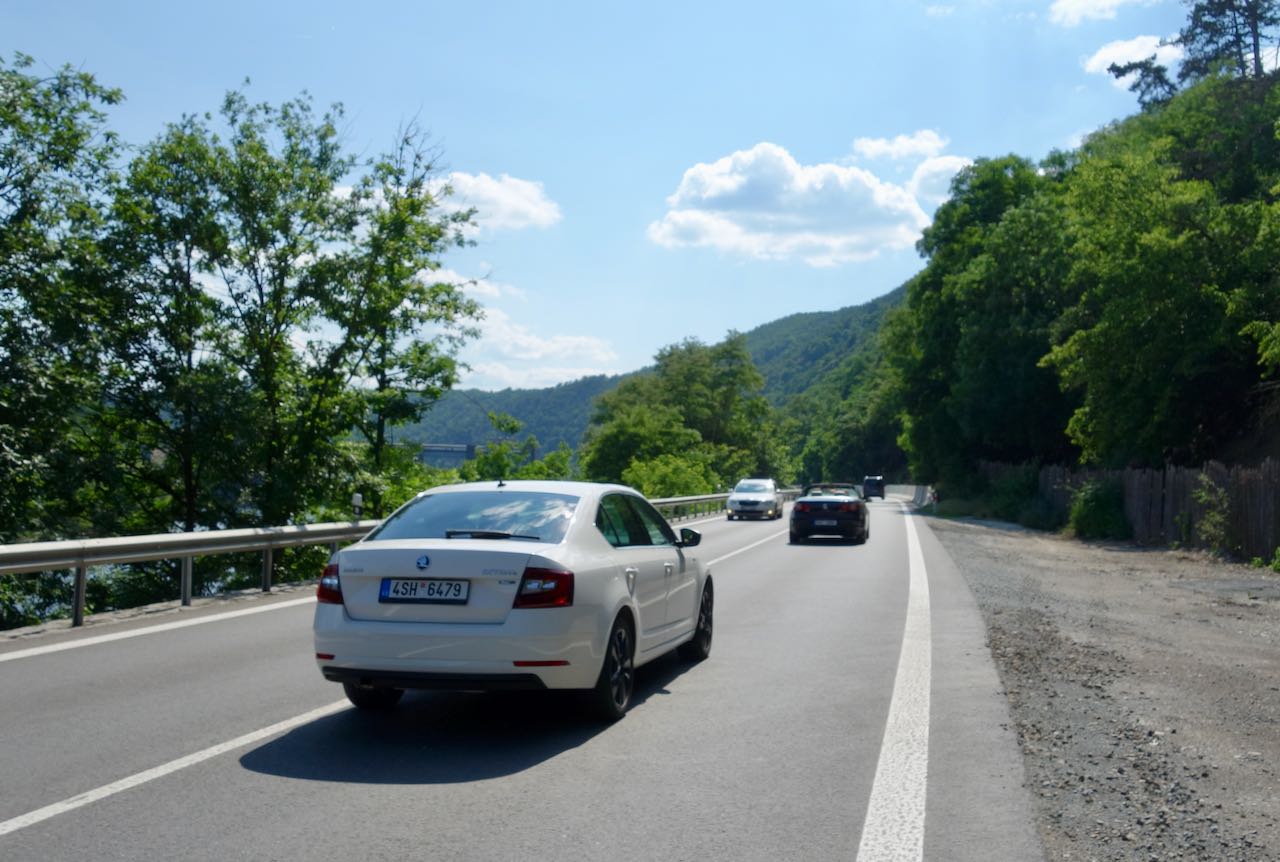 The biking was so delightful that I missed a turnoff where we needed to cross the river. We biked all the way south to a place called Vrane nad Vltavou where the east bank road essentially ended. We had to backtrack by bicycle ten kilometers north to a bridge to cross over to the western bank of the river, as the main highway was the only route in a narrow section with steep slopes on both sides. Cycling on this highway was mildly stressful. We stopped for ice cream at an outdoor space that adjoined a gas station. Several other patrons had friendly little dogs. The ice cream was all soft serve.