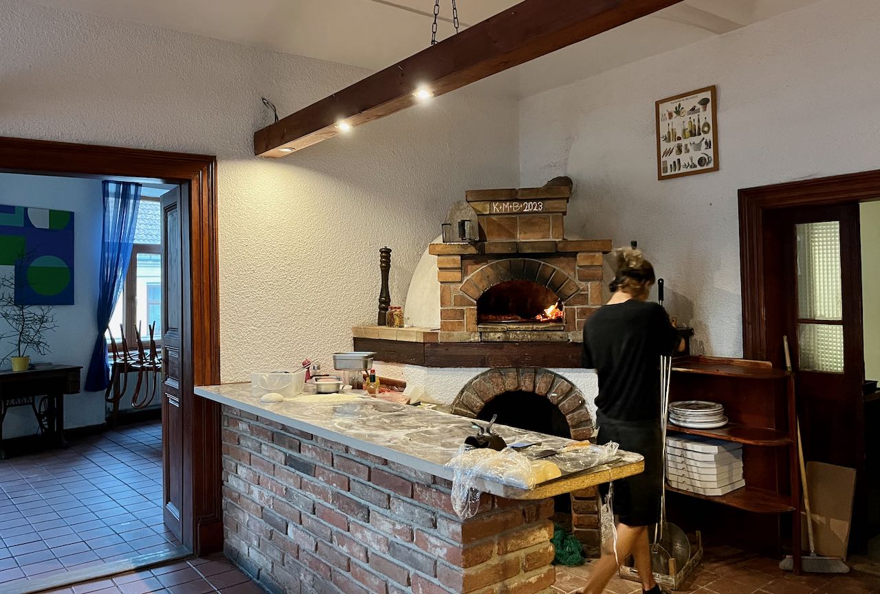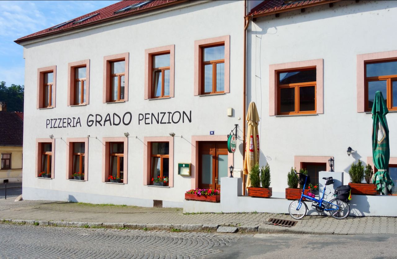 The village of Davle gave us an opportunity to get off the highway. My map showed almost no hotels out here in the Prague exurbs, so there was little incentive to bicycle further. Why not stop now while we were ahead? Utilizing Google maps we had found a place that looked to be both hotel and restaurant. At about five on this Sunday afternoon I walked into the empty main dining room of the Pizzeria Grado Penzion (with its pizza oven) and said (in English) that I wanted two rooms. It took them a couple of minutes to even understand what I was saying, but the guy offered us a special situation, two rooms connected and sharing the same bath, all for about eight-five US dollars total. As we were to find in all of Czechia, everything was clean and modern. It was hot and there was no air conditioning in the rooms, but they cooled off after we opened the windows. The downside was traffic noise from the highway.