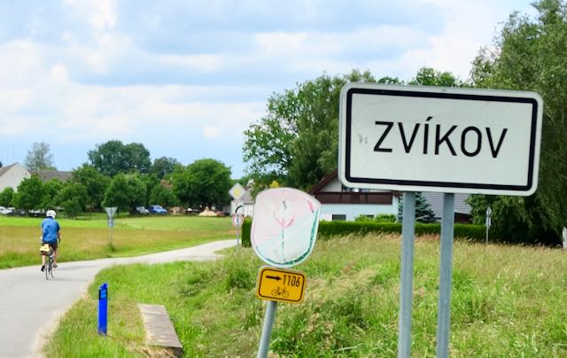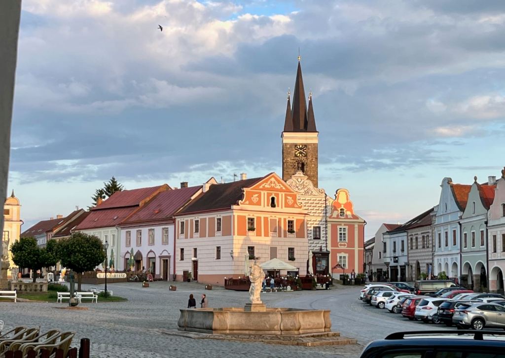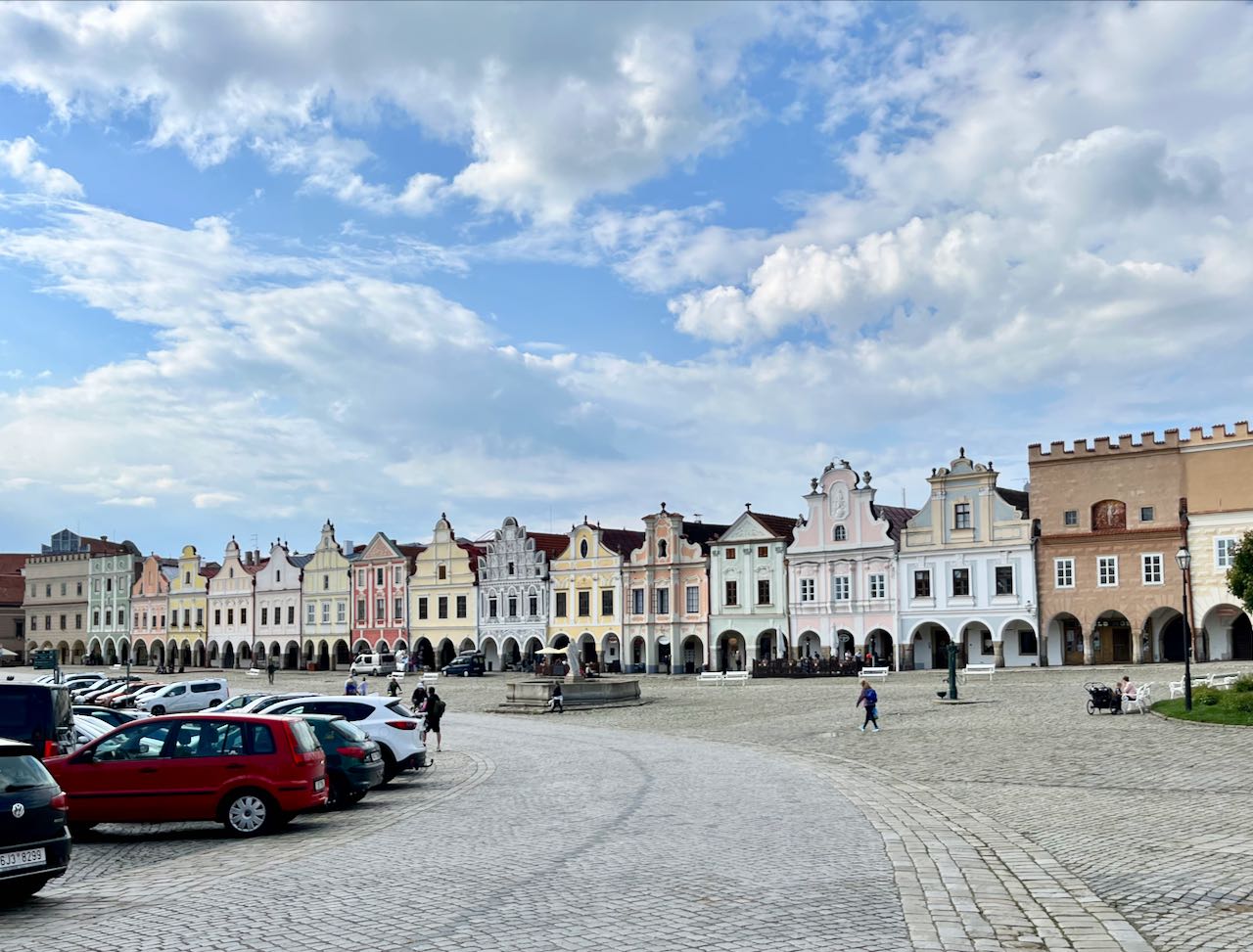 Our destination this new day would be the town of Telc, a little less than fifty kilometers away. Telc was billed as one of the most intact medieval town squares in Czechia. Before the rain started, the cycling this day was delightful; forests, small towns, almost no car traffic.