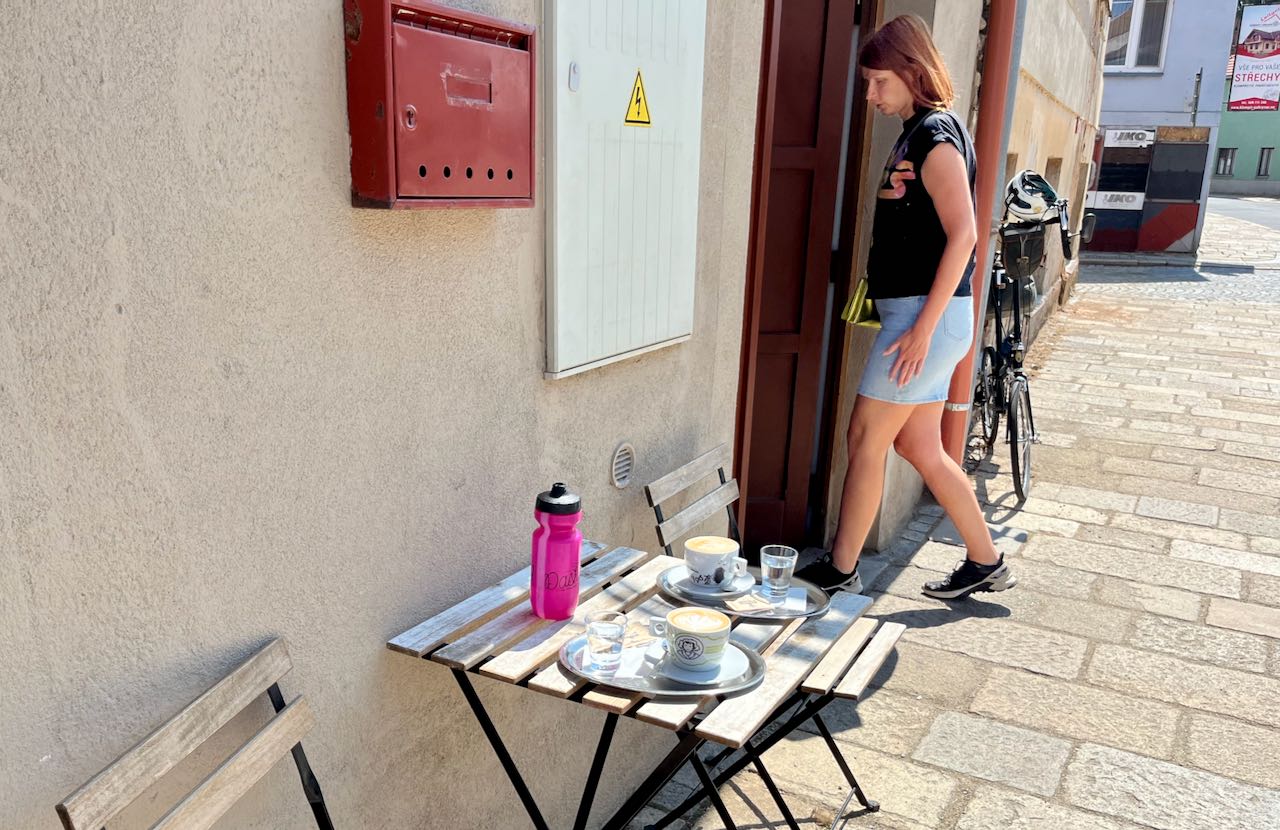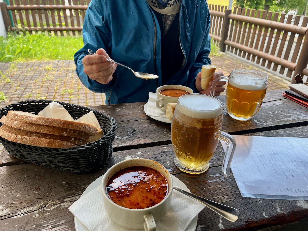It rained for the latter third of the day’s bike ride. We got wet and cold. There was no alternative but to keep going, really. In the rain we came upon a town called Krahulci, just six kilometers before Telc. It was Saturday afternoon and a roadside restaurant was full of families. The only open tables were outside under umbrellas, providing only partial protection from the rain. We sat down anyway. Beer, hot soup, and brown bread really hit the spot.