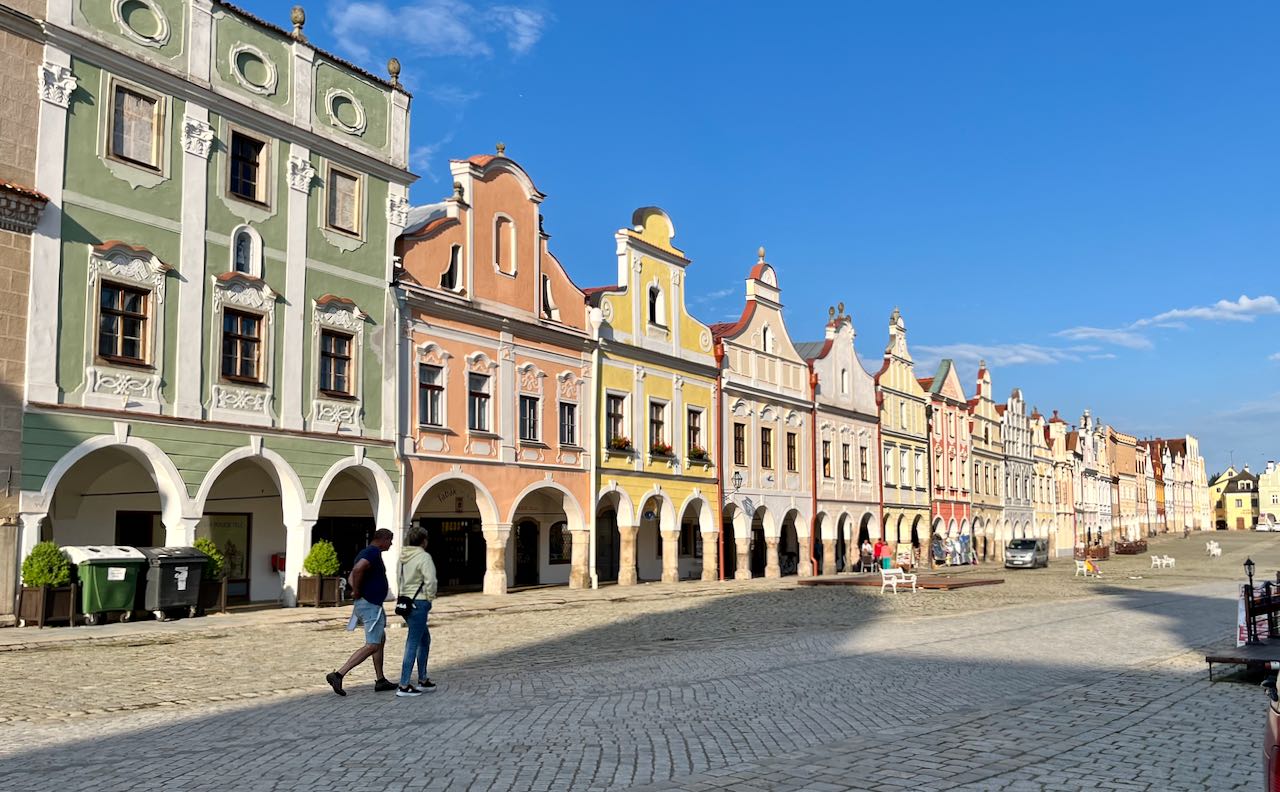 It was raining on and off when we cycled the further half hour on a rural highway into the medieval town of Telc (population 5,100.)