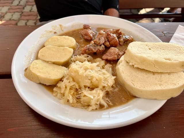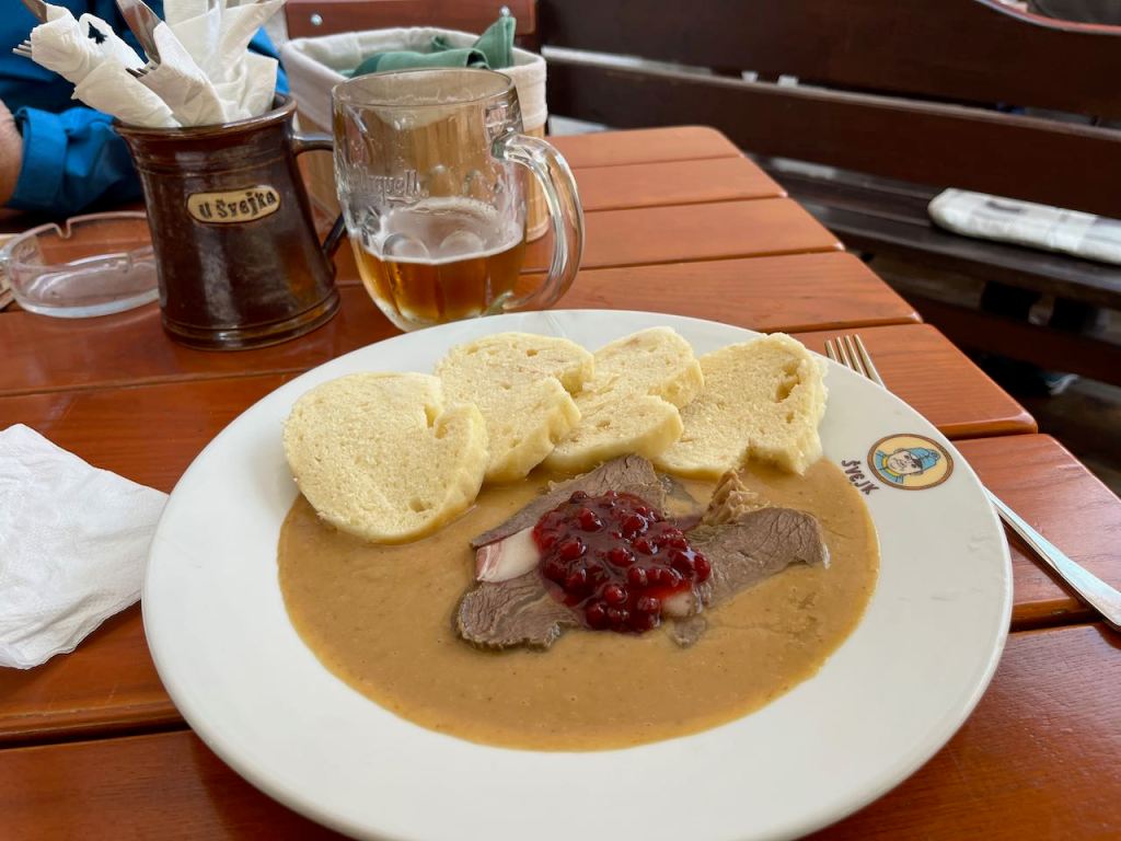 You wash it down with beer. Czech beer is delicious but almost all of it seems to be the pilsner type. The exotic craft beer varieties including IPAs that are the rage in America might be available somewhere in Czechia but we did not see it. The Czech bartenders always put a big “head” in their pour.