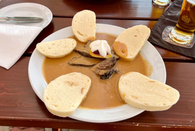 We had a nice outdoor meal that evening. At least in restaurants, Czech food is all about meat, gravy, and some kind of starch. Vegetables are mostly nonexistent. The Czechs serve several types of starch that translate into the English word dumpling. One is yeast bread dough that has been boiled instead of baked. In restaurants they slice it up, artfully arrange it on the plate, and you sop up your gravy with it.