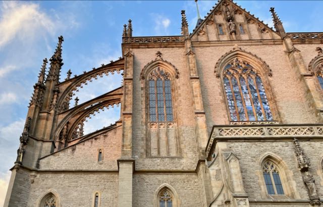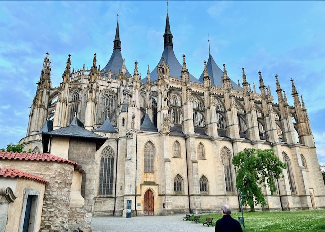 After dinner we walked up a hill from the medieval downtown of Kutna Hora to another huge cathedralesque church, the Church of St. Barbara with its flying buttresses, begun in 1388 and finished in 1905. It was financed by centuries of income from local silver mines.