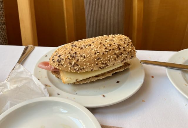 Like we had for several days we had surreptitiously each made a sandwich at the breakfast buffet of our hotel and taken (stolen?) the sandwich and a piece of fruit with us, for a picnic lunch on the road. The first time I did it I felt guilty but I got over it.