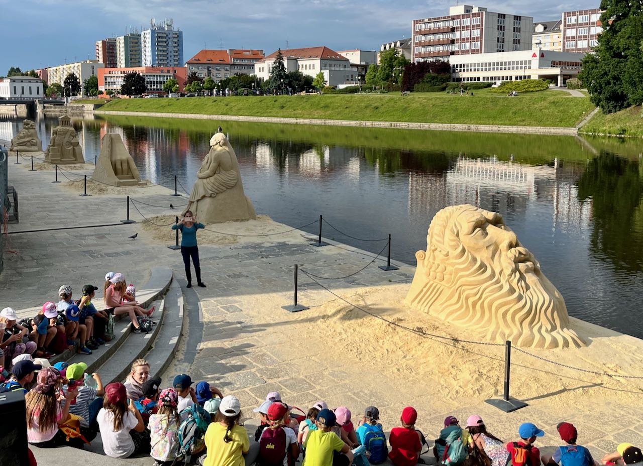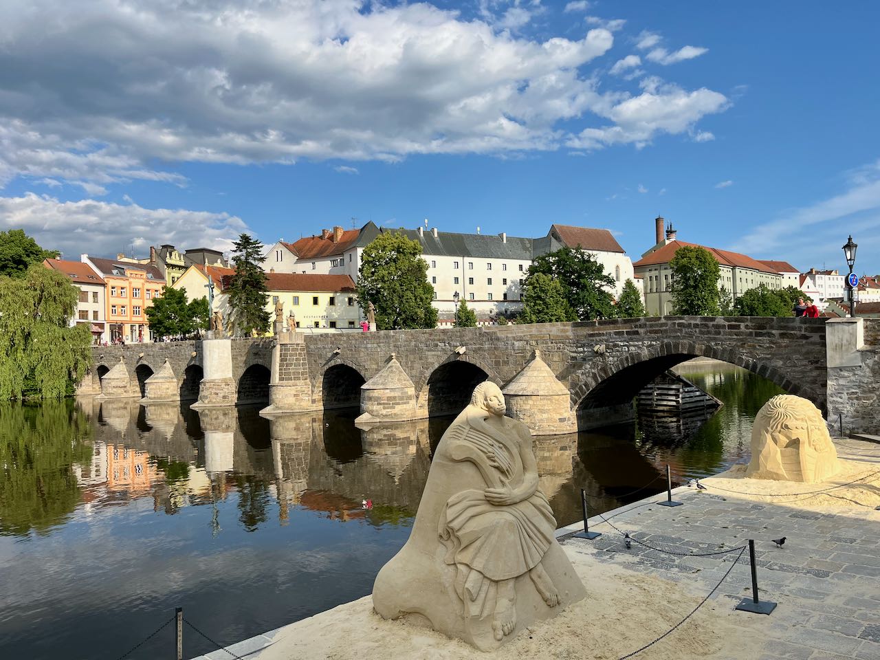 We did not see any, or at least hardly any, other tourists or Americans in Pisek (population 31,000). It has a reputation as a college town. There is a famous bridge dating from the 1200’s, supposedly the oldest bridge in Czechia. We saw the results of a sand sculpture contest next to that bridge.