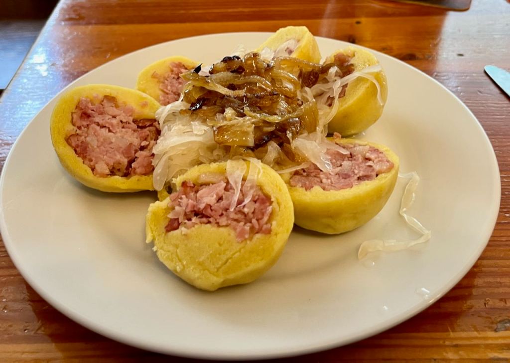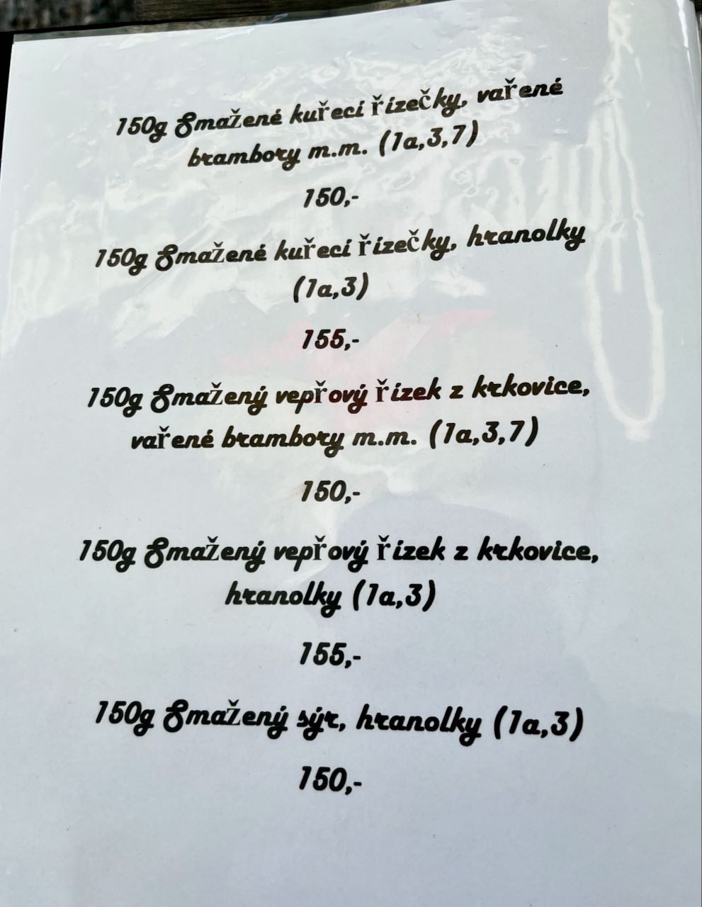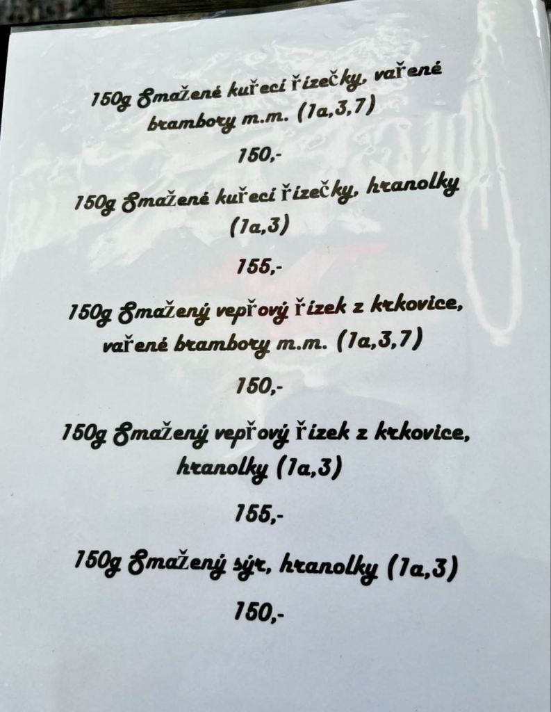 Google Translate has improved and now gives an almost instant translation of a one page menu on one’s I-Phone. Food communication before Google Translate at remote restaurants was way more colorful. Note that like the Germans the Czechs like knowing exactly how much meat each dish contains, in this case 150 grams. The price of 150 Czech krona equals just under US$ 7.00.