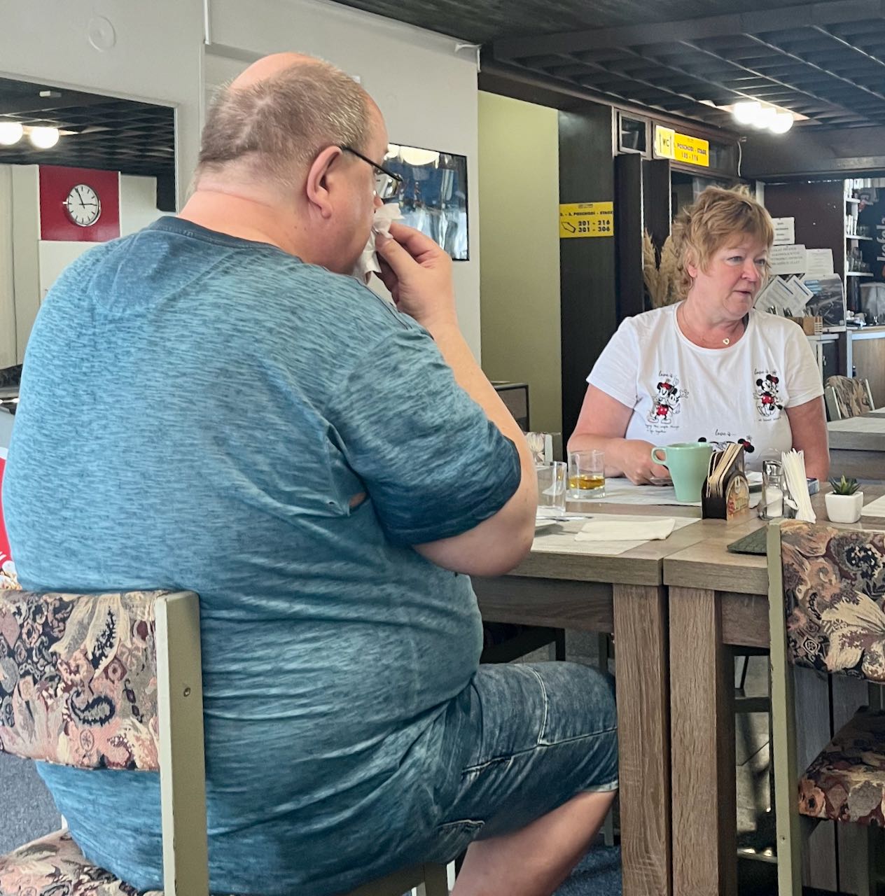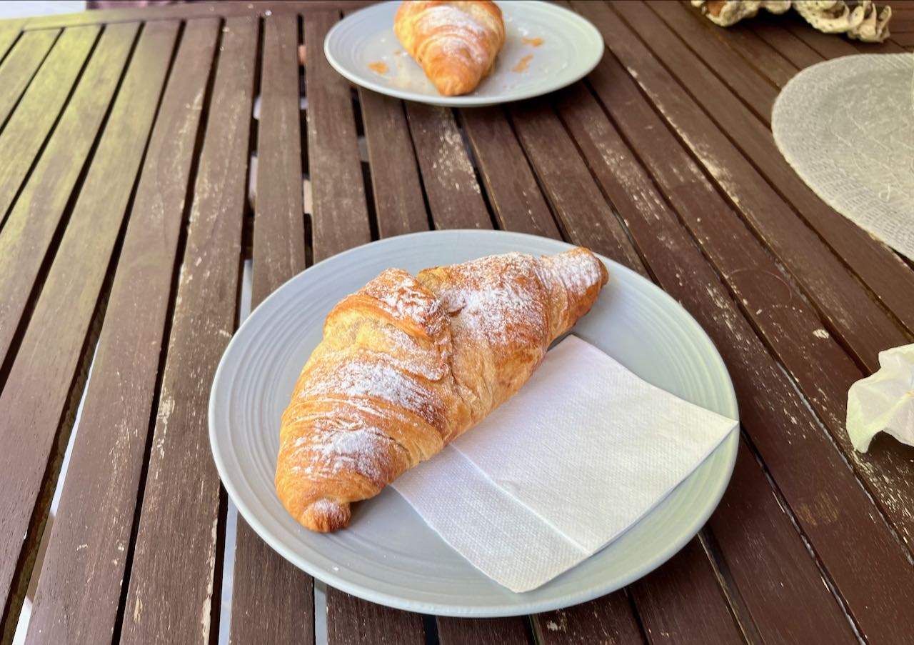 Brother Alex had told me not to expect perfection with Czech baked goods but here at a bakery called Ella Ma Kava they offered delicious and obviously just-an-hour-or-two-old baked croissants, served on an actual plate. It wasn’t on the menu but a woman at another table was eating what looked like a ham and cheese sandwich; Lyman ordered one of those as well. I got my usual coffee, available even here in Czechia, oat milk latte with one pack sugar.
