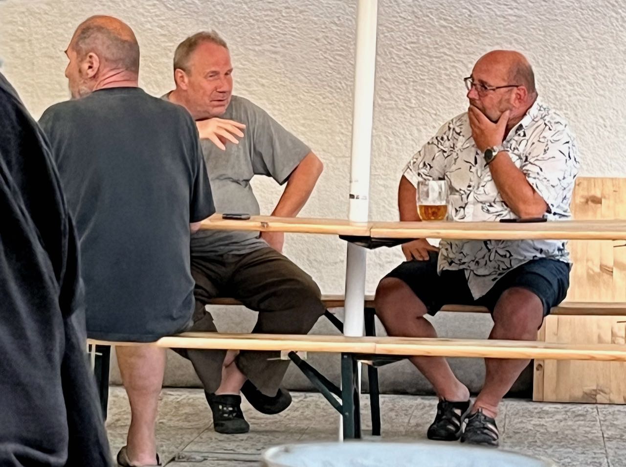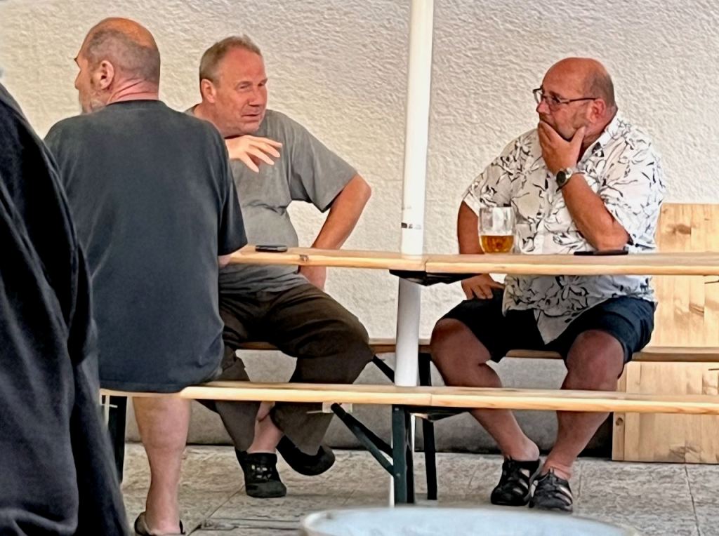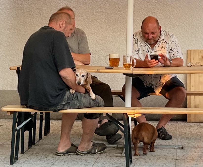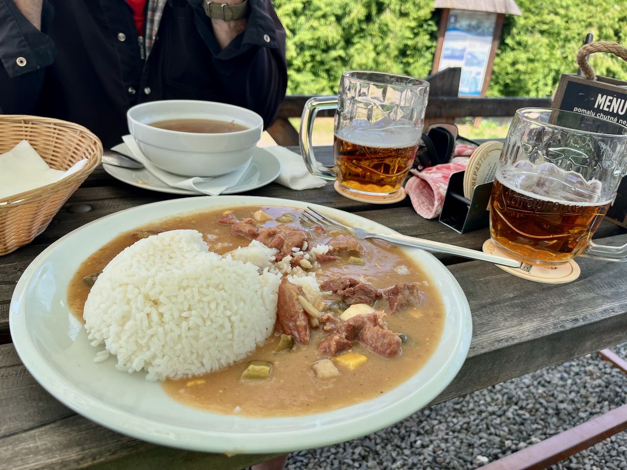 I like a big lunch. This day it was a very Czech meal of meat and gravy. Rice was an unusual choice, the Czechs usually eat potatoes or dumplings. Lyman just got a soup. Beer was a must.