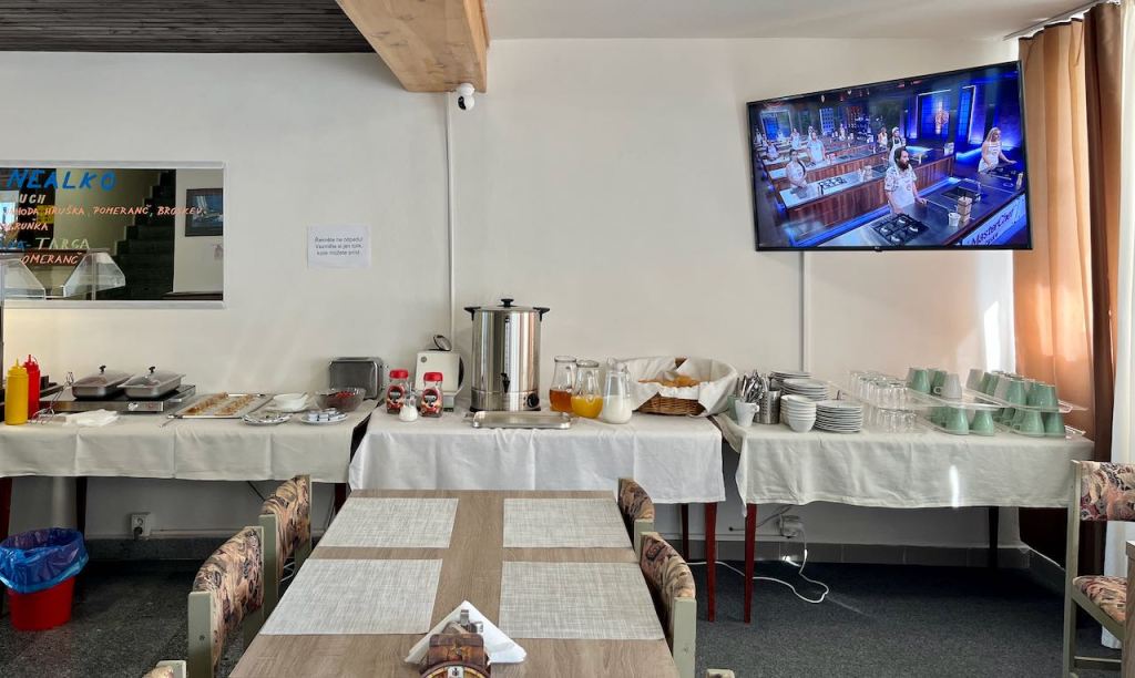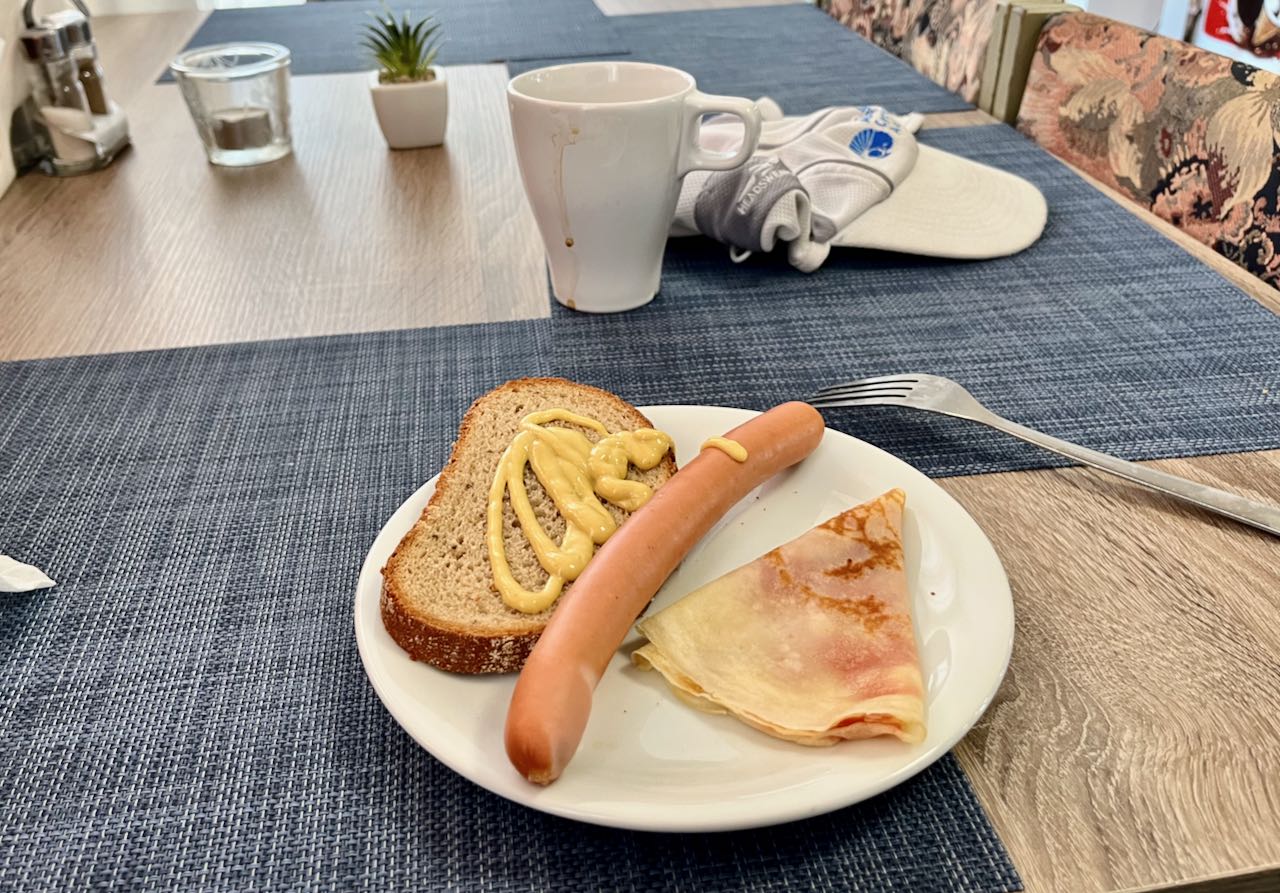 Breakfast the next morning at the Panorama Orlik was colorful, all set out for Lyman and me and our fellow diners in front of a dumb Czech TV game show. Unlike every hotel breakfast in America it was not a bunch of prepackaged junk food. The cook we had met the night before had gotten up that morning and made little crepes folded around strawberry jam. For the upcoming bike ride I needed calories! From the buffet table I selected what, to an American, looked like a foot-long hot dog, and Czech brown bread, with dijon mustard. Something different!