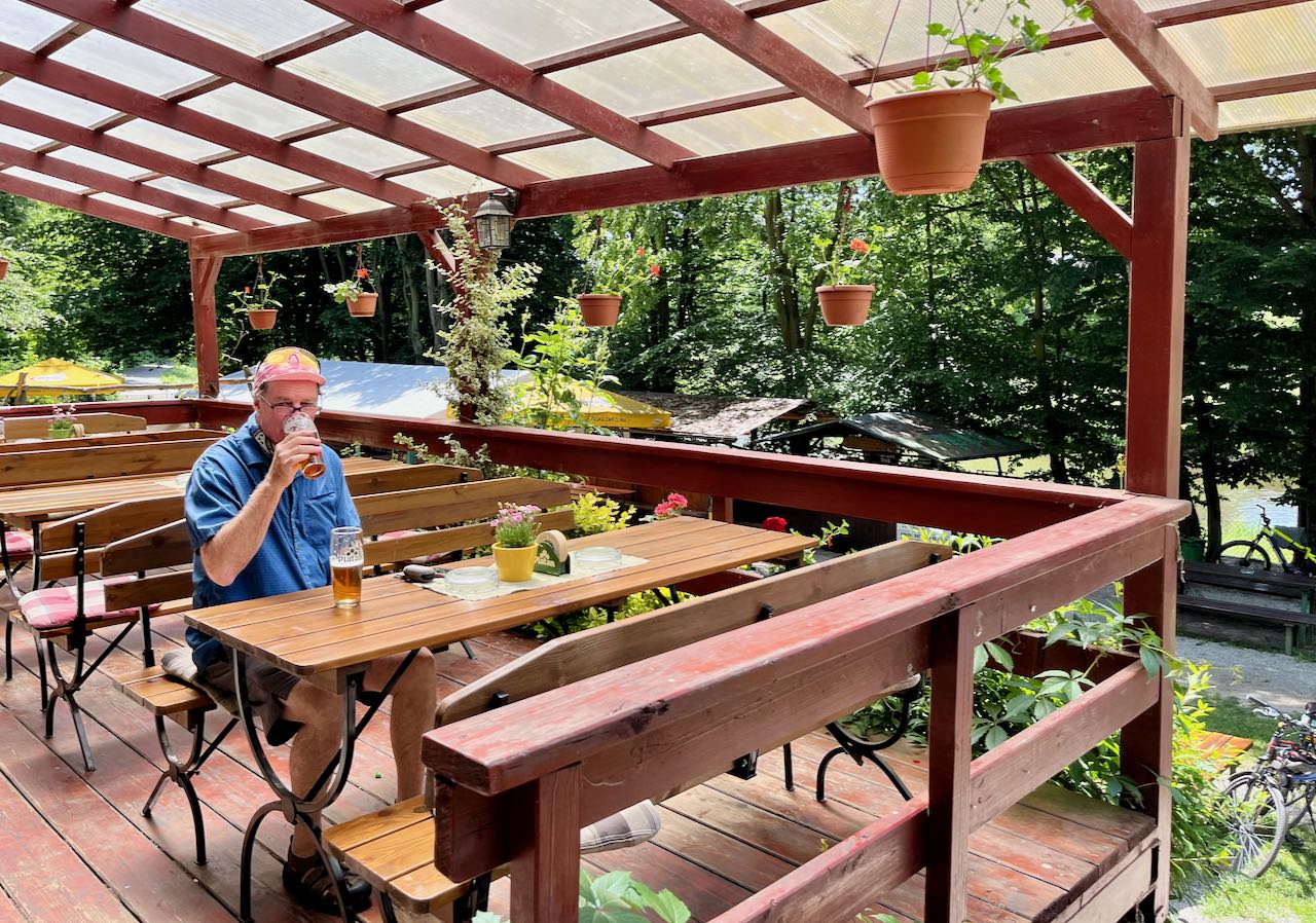 On the final two or three kilometers into Pisek there was a separate bike path and on that path was a beer garden. We stopped for a beer and a late lunch. There were two friendly young women tending bar. We both ordered sausage, one of them sausage covered in bacon! Both of us later regretted eating that much grease but it seemed like a good idea at the time and it was all delicious.