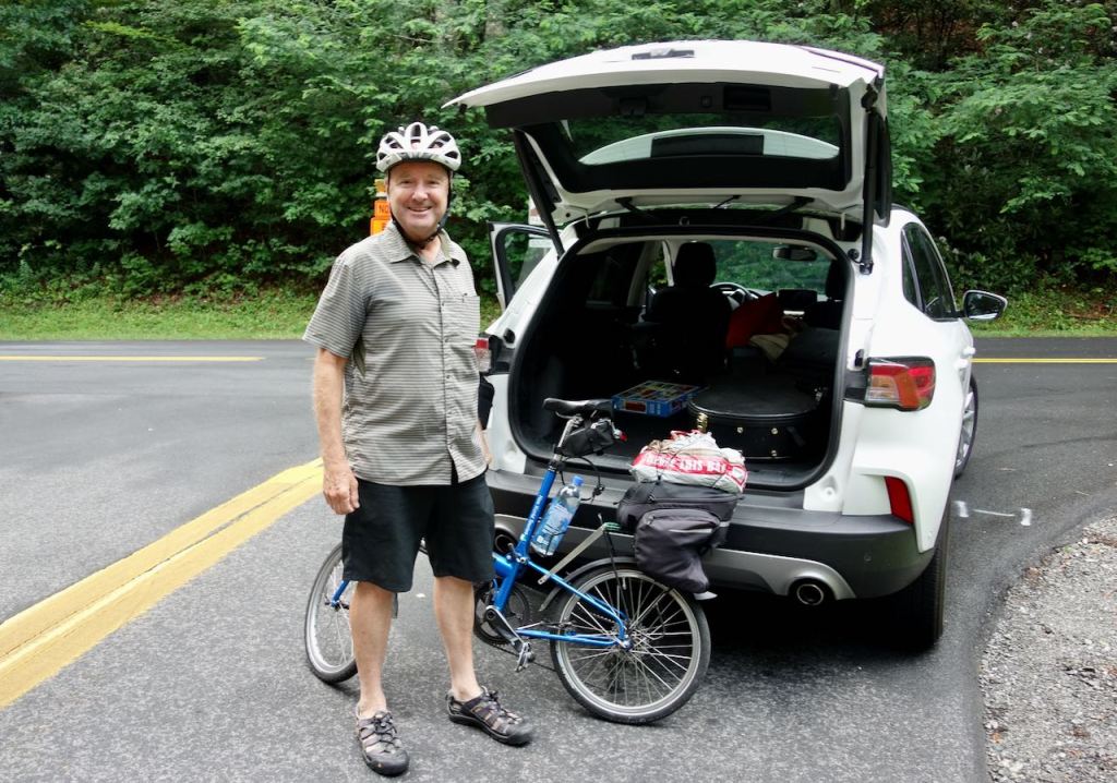 My plan was to cycle north on the Parkway on my Bike Friday for three days. Most of the trip would be in Virginia. I planned to terminate the trip at the Roanoke airport where I had reserved a rental car, about a hundred and twenty miles away. The weather promised to be eight or ten degrees cooler than most of the southeastern U.S. People do come to these mountains in the summer for a reason. On this three day bike ride the Parkway elevation varied from about 2300′ to 3200′ going up and down the whole time. On the third day there would be a big descent the last five or six miles into Roanoke.