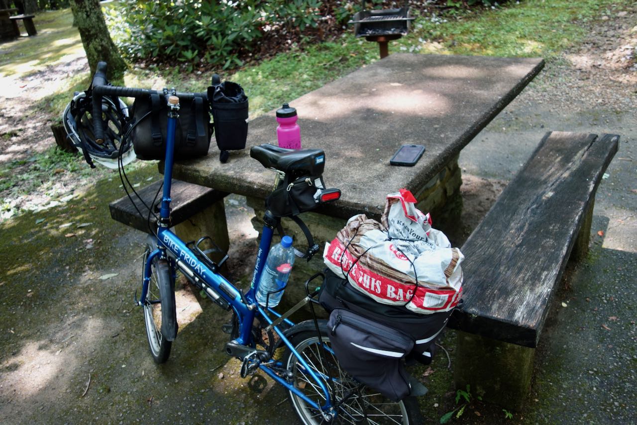 A major issue with cycling on the Blue Ridge Parkway is its intentional remoteness. There are hardly any stores or restaurants or hotels near enough to the parkway for a bicyclist to reach easily. Unlike my typical style of bicycle adventure, I had planned my lodging in advance. I brought my own food with me on the bicycle, enough for the first two days, including bread, peanut butter, and honey.