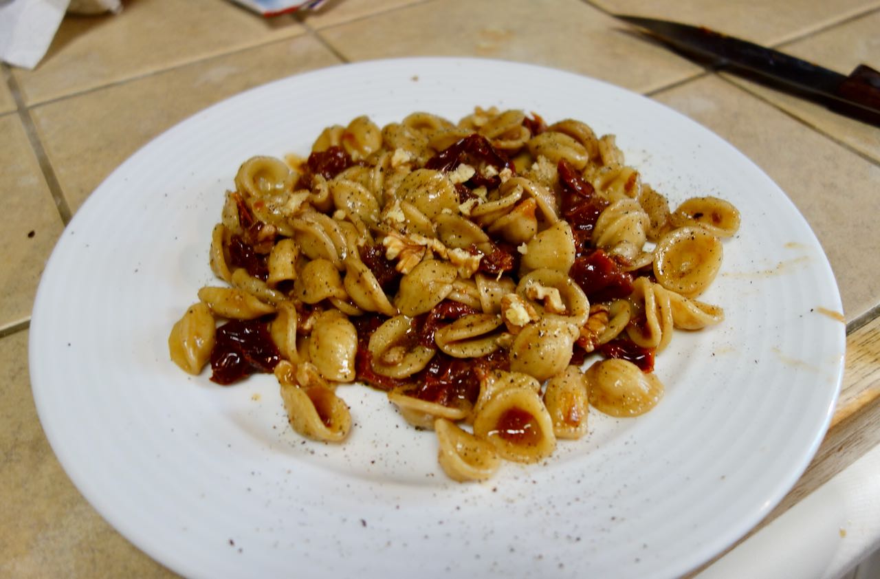 There was a full kitchen but I had to have brought my own food on the bicycle. Canned tomatoes are heavy and meat needs refrigeration, so I had brought dried orecchiette pasta, sun dried tomatoes, and a piece of quality hard salami. I did have to lug two essential liquids up and down those mountains. It had taken some looking but I managed find both in small plastic bottles.