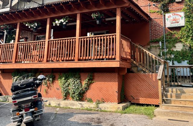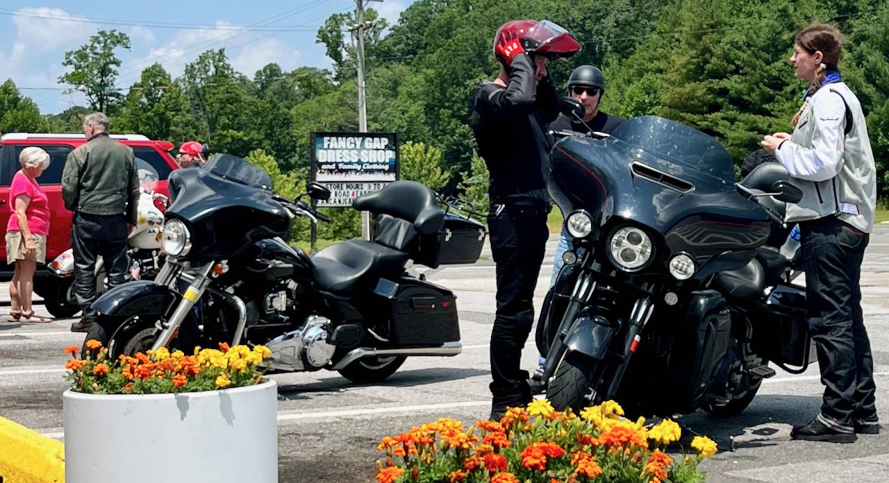 I had prearranged an Airbnb that night a few miles north of a spot called Fancy Gap VA. Although you could not see them from the Parkway at Fancy Gap there were a couple of stores on the crossing highway. I went to a gas station and bought a prepackaged cold Starbucks milk coffee drink, then rested on their bench in front. I watched a group of motorcyclists. Some had come from faraway places like New York State and Ontario, Canada.