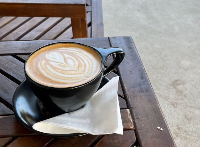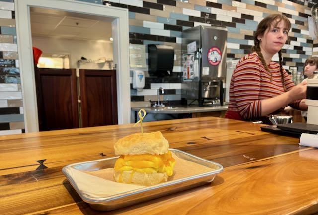 I needed calories to power me through the wilds, so I got an egg and cheese biscuit, plus an oat milk latte, one pack sugar. I sat on their front porch, delighting in the early morning vibe.