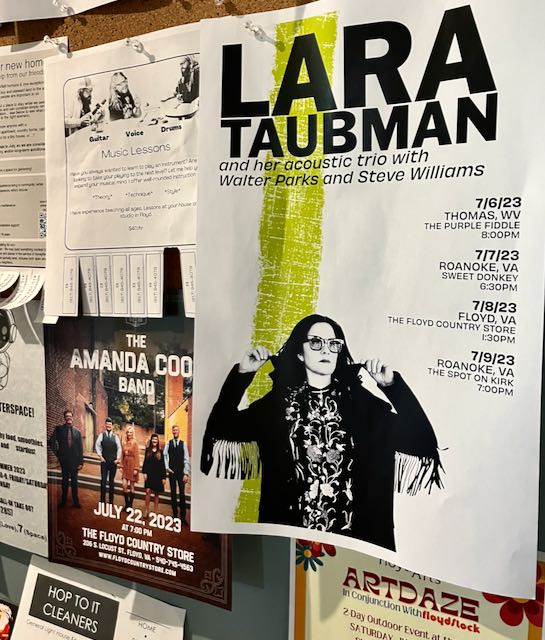 There were posters on the bulletin board announcing all sorts of local music events. Looking up this performer Lara Taubman, on her website she says she is proud of her Southern roots but now lives in Manhattan NYC!