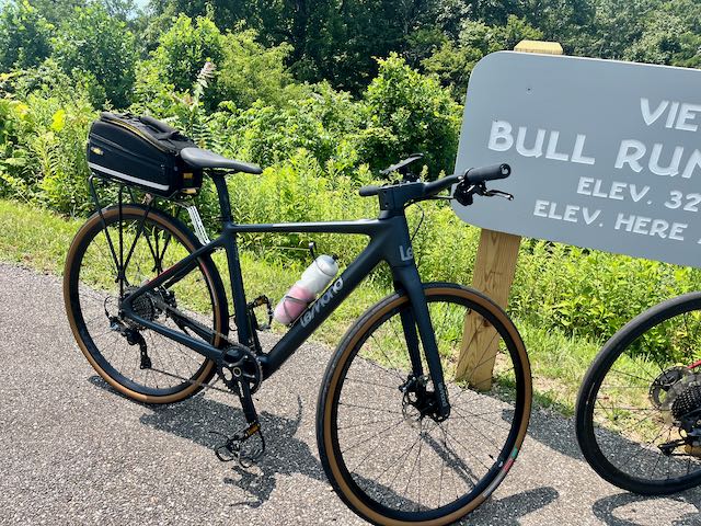 At the next overlook I met two friendly women bicyclists about my age sitting on the curb and eating lunch out of cans. They said they cycle the Parkway regularly. They live about eleven miles downhill from the Parkway near Rocky Mount VA and said for years they had regularly cycled unassisted up the switchbacks to the Parkway; gaining something like two thousand feet in elevation on a six or eight mile climb, an impressive feat. They also said (in their colorful Southern style) that at their age they recently had had enough of that, and both had just gotten electric assist bicycles mostly just to get up those switchbacks. After coming up the mountain they would pedal conventionally. One showed me her Lemond brand electric assist bicycle, weighing only twenty-six pounds. Achieving light weight on an electric assist bicycle can be expensive. She was embarrassed to say what it cost but I guess significantly more than five thousand dollars. The black bag on the back is an add-on, she uses that to carry her lunch.