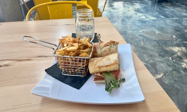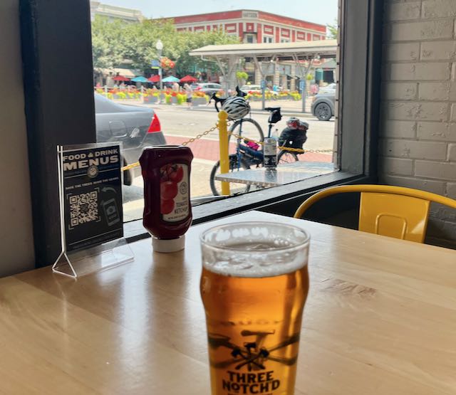 There was still time for a late second lunch. My newfound women friends back on the Parkway on electric assist bicycles had suggested I seek out Three Notch’d Craft Kitchen and Brewery in downtown Roanoke. I got a beer, chicken sandwich, and fries. I could keep an eye on my bicycle while relaxing indoors in the A/C. The descent from 3000′ to 800′ elevation had changed the weather entirely. It was now hot, just like almost everywhere else.
