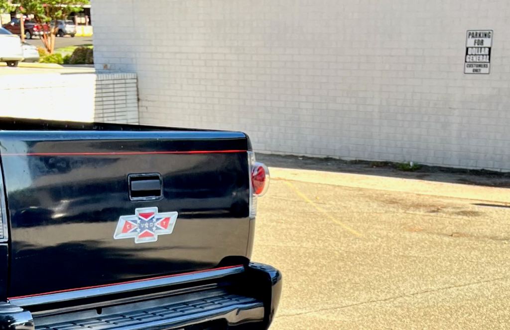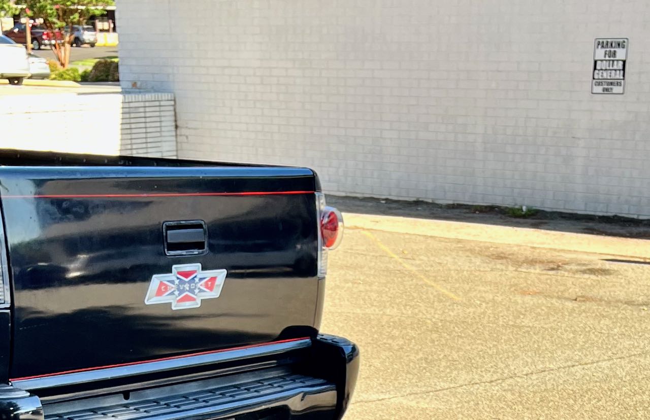 I had an unscheduled half hour struggle in the normally one minute procedure of unfolding my Bike Friday from the trunk of my car. I will spare my readers the details, but it was a mechanical problem. While wrestling with the bike in front of downtown Mebane’s only real merchandise store, a Dollar General, I noticed a guy in cammo parking a truck with a Chevrolet Confederate sticker. One never sees this kind of sticker in Chapel Hill twenty miles away.