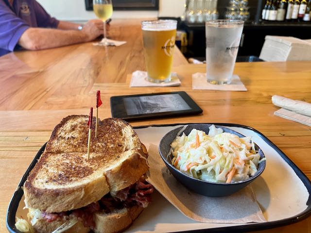 On this particular day I chose not to cycle any further into Greensboro than into downtown. It was almost 2:00 PM and I had not had lunch. I would be taking Amtrak back to Burlington at 3:55 PM. Only a few blocks from the Amtrak station was Natty Greene’s Brewing Company. I sat at the bar and ordered a beer and their version of a reuben sandwich. One choice of side; I took slaw.