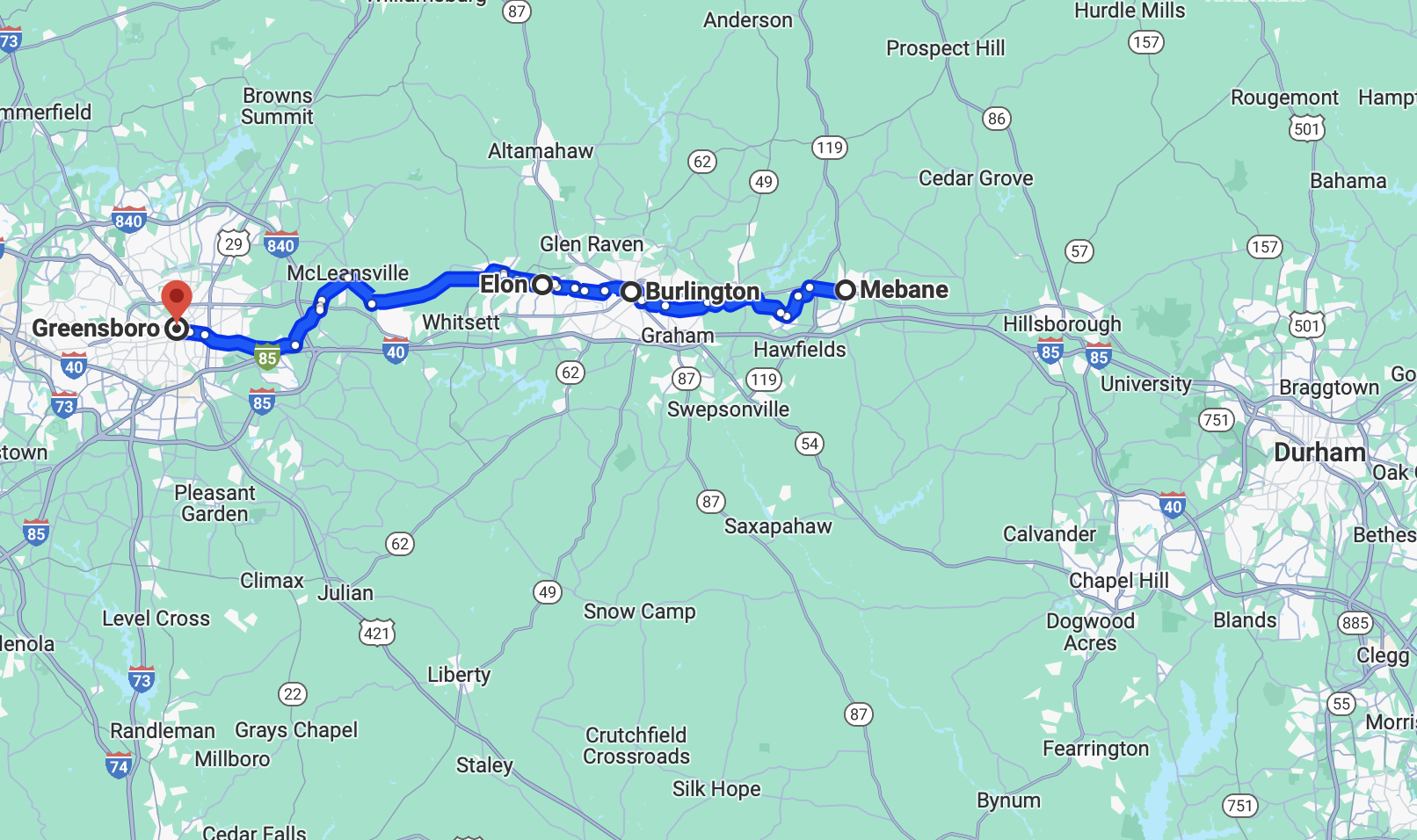 Mebane is part of a strip of industrial and textile mill towns of varying sizes that line I-85 between Durham and Greensboro. From Mebane it is thirty-some miles in one direction to Greensboro and twenty-some miles to Durham in the other. The state owned rail line also follows this strip. The weather at least for one day in late summer was unusually cool and dry. For that one day, why not drive to Mebane, leave the car there, then cycle to Greensboro? I could take the Amtrak for most of the return.