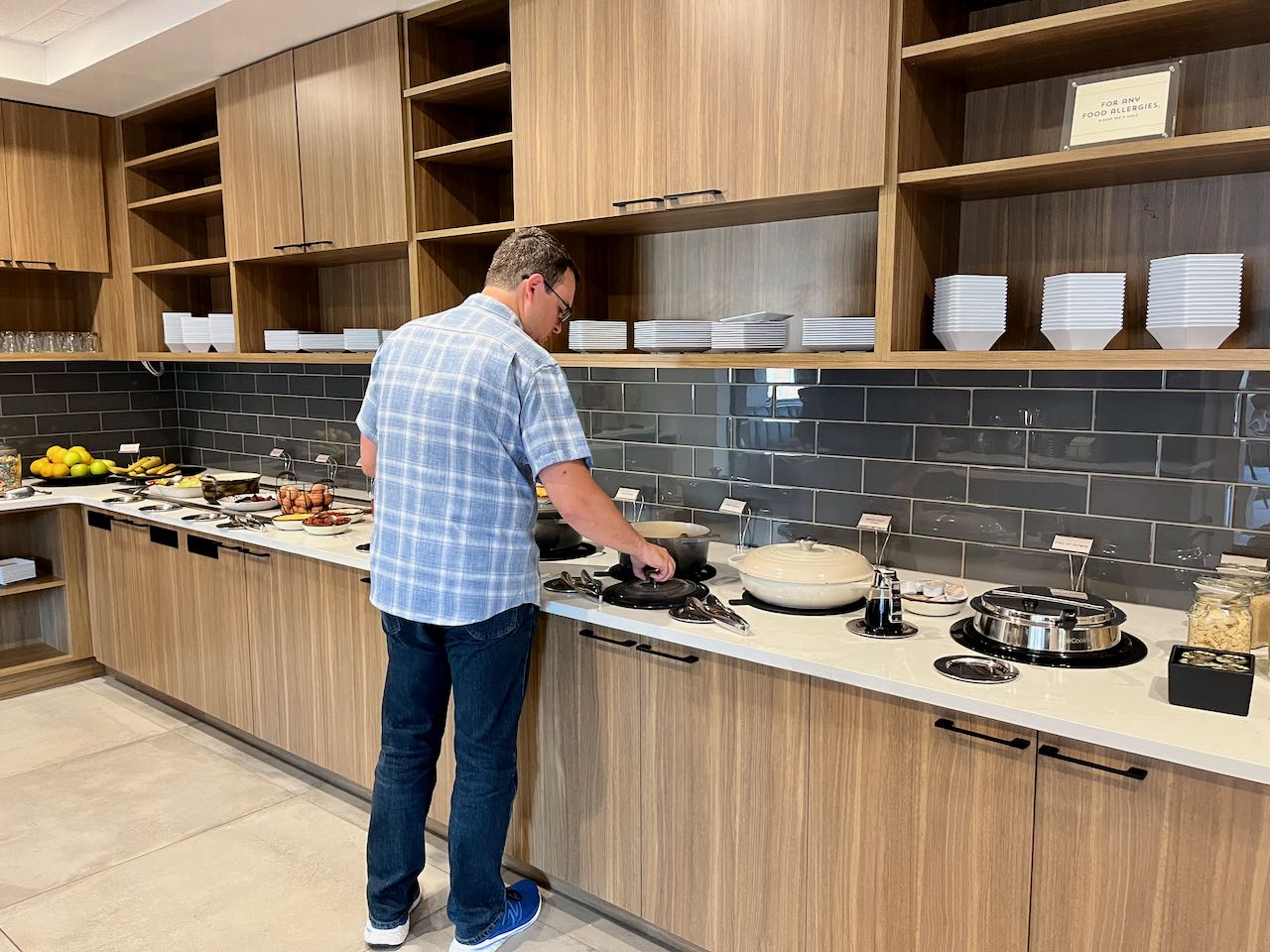 I ultimately ate German schnitzel outdoors at a table on the sidewalk. Next morning the breakfast buffet at the Hyatt was industrial food, but they get huge kudos for serving everything on real plates and from genuine serving dishes with no disposables in sight.