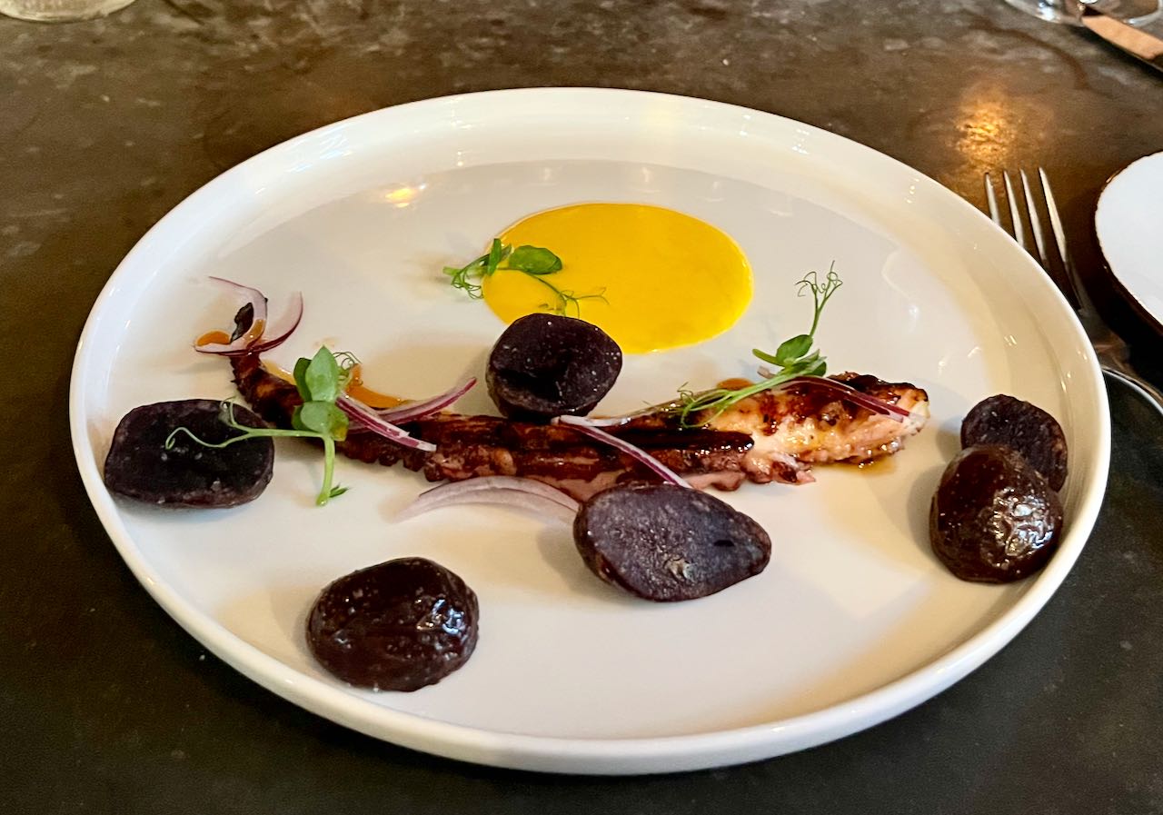 First course was grilled octopus arm, something I have had only once before. It was amazing. Years ago I unsuccessfully tried to make it at home. Talking to my server, she said the octopus arm was first marinated, then pan fried in butter for a few seconds, then grilled on a very hot fire for one or two minutes. The small purple rounds are potatoes. I treasured each succulent bite.