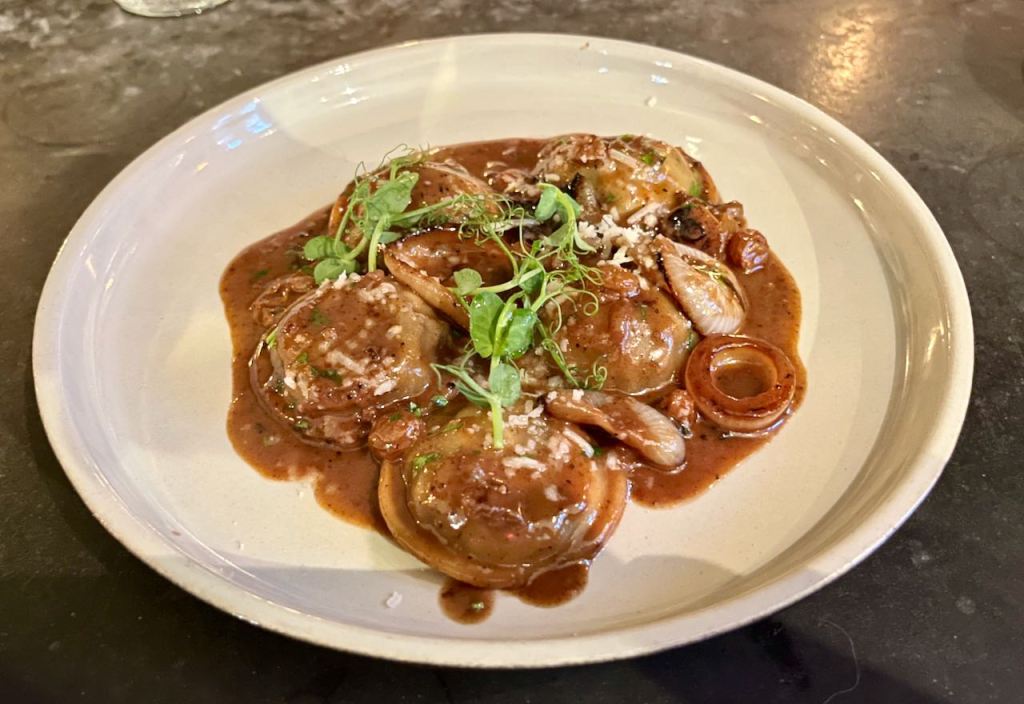 One no longer needs to visit New Orleans to get food like my second course here in Wilmington DE, braised oxtail ravioli. It ate just like it sounds, lucious stringy beef wrapped in dough, covered in a buttery sauce with onions and a few raisins for a twinge of sweetness.
