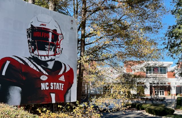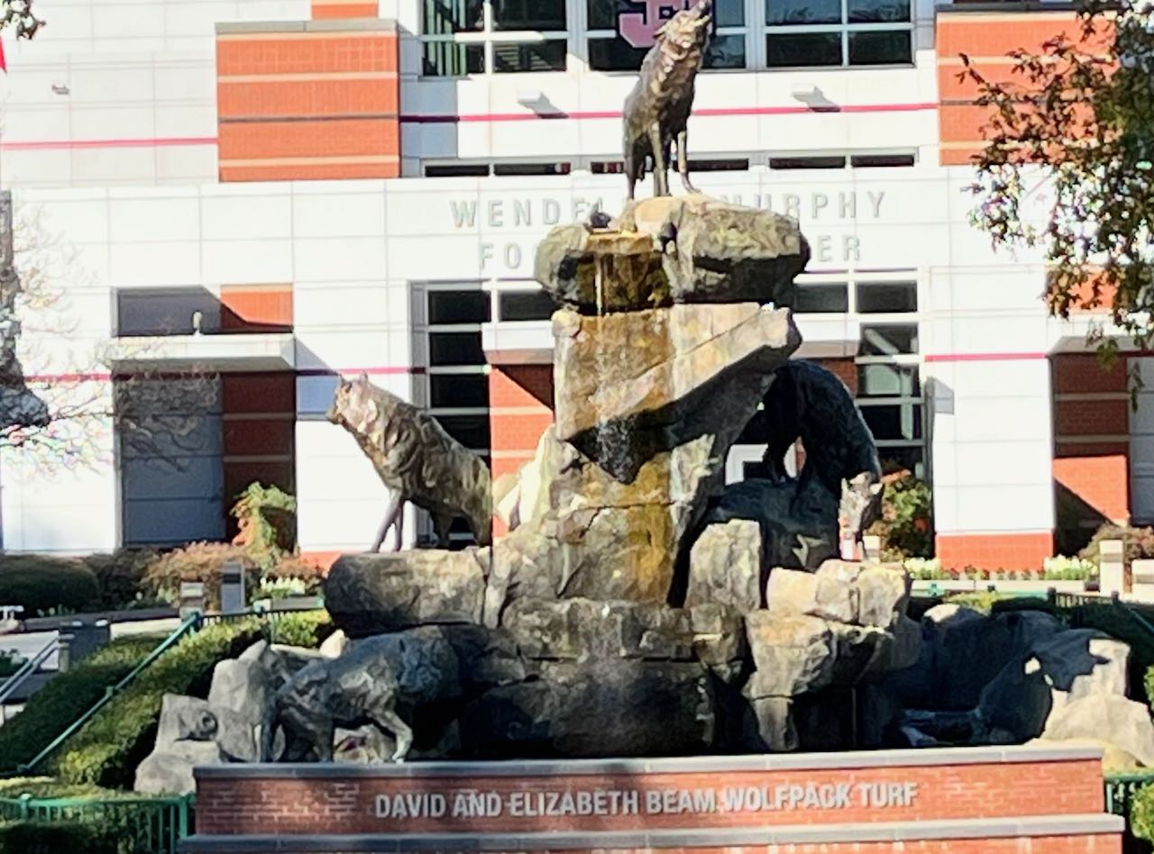 Crossing over the railroad tracks I passed the NC State football stadium. Since the major universities have not been able to offer the best high school football players actual money, they entice impressionable seventeen year olds with creepy macho sculptures of a wolfpack outside their football pantheons.