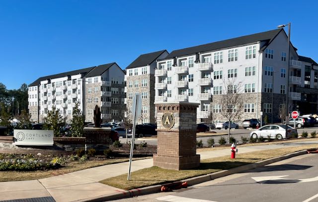 This leads to Morrisville Carpenter Road, but take a right at Good Hope Baptist Church, then pass by Panther Creek High School. You have to schlep the bicycle across highway NC-55. Eventually I passed through neighborhoods that were really new. In an area that was cow pastures ten years ago, these apartments were not here when I last cycled through the area six months ago.