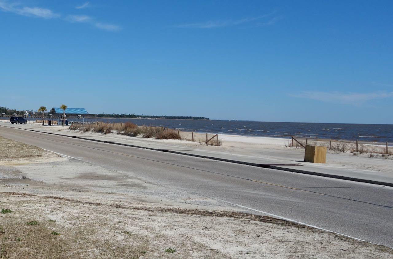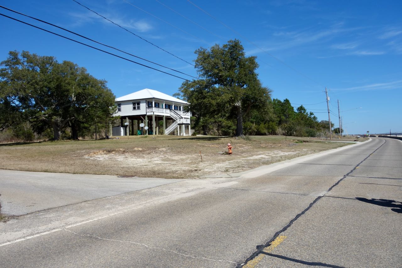 The lovely beach facing this highway opens onto murky Gulf protected waters. Offshore islands keep waves almost nonexistent in normal weather. We always joked when coming to this beach in the summer you can wade half a mile out and the flat bathwater still only comes up to your thighs, This innocent looking sea has risen mightily in hurricanes several times in the past fifty years, especially Hurricane Katrina in 2005 and Hurricane Camille in 1969. The storm surge destroyed nearly everything near the beach and sometimes as far as a mile inland. Huge swaths of previously developed beachfront property now remain empty. Most new construction is on stilts.