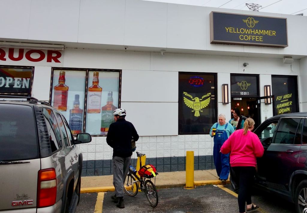 Neither of us needed to get back to New Orleans until the next day so we decided to park the rental car and bicycle around Mobile AL, a city neither of us felt we had seen enough of. The rain eventually stopped but it was cold and windy. We needed a coffee and a roll. so we cycled a couple of miles on a dangerous busy highway to the Mobile AL chain Yellowhammer Coffee.