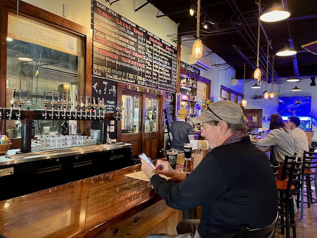 How far should we bicycle this evening? I am always trying to press on, for no other reason than pressing on helps my psyche. Lyman has a more balanced view. The trip two years earlier had ended badly. We stopped to discuss it at the Chandeleur Island Brewing Company in downtown Gulfport MS.
