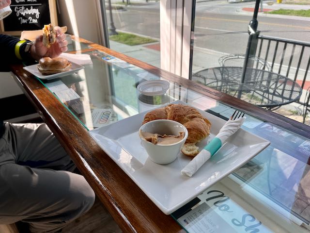 The next morning we cycled over to the cheery and locally owned Boozer’s Brew & Cafe Too, which serves its offerings on actual plates. I ordered a croissant with peanut butter. It was fine, but the bread was not particularly fresh, and the peanut butter was the less healthy homogenized type.