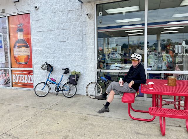 Arriving into the exurban sprawl of Gautier MS, just across a river and swamp from Pascagoula MS, we could not find a coffee house so we bought drinks at a gas station. There was a convenient table out front. Louisiana’s Community Coffee dispensed by machine now is available in many such stations, but my flavored cappuccino was so sickeningly sweet that I dumped most of it out and mixed it with regular coffee. Lyman got a plastic pint of chocolate milk.