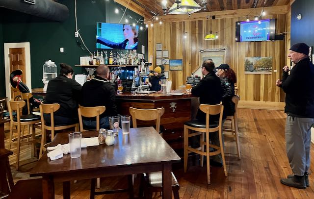 Pascagoula’s faded working class downtown has a few restaurants, including Scranton’s, owned for more than forty years by the same family who ran our B&B. Ranks are diminishing in America of family owned restaurants downtown with reasonable prices for local cuisine, especially one that is open at night and serves alcohol. . Lyman and I both had delicious shrimp and grits at the bar, talking to a guy about our age who was doing what I am discovering in my travels to be a frequent American strategy, drink multiple cocktails and then leave with takeout. In another room they had just finished Trivia Night.