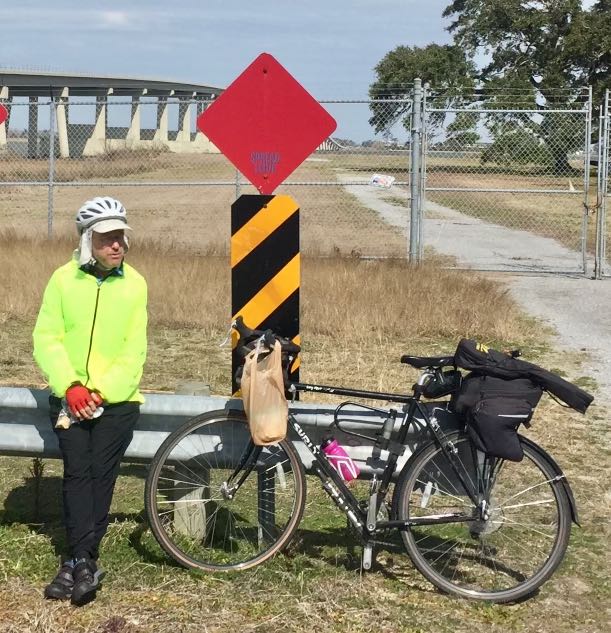 New Orleans city limits end at a waterway called the Rigolets. We stopped for a picnic lunch on a guard rail; peanut butter and jelly sandwiches on Dave’s whole wheat bread.