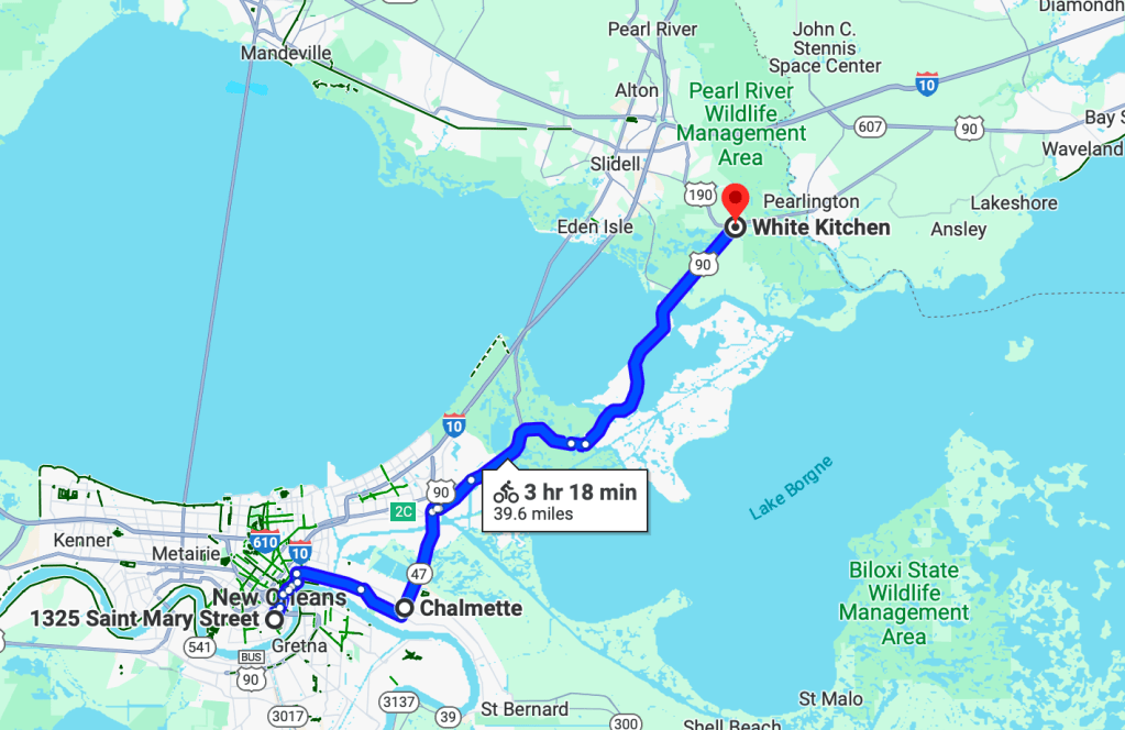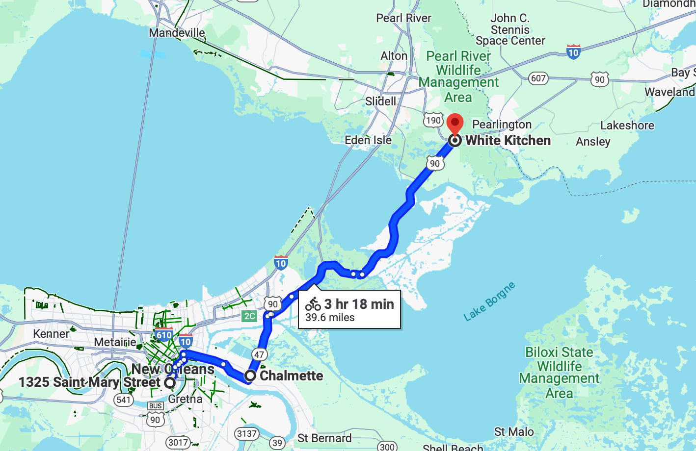 The ill-fated 2022 ride started on a Sunday morning. Lyman and I set out bicycling eastward from central New Orleans, him on a folding Bike Friday and me on my conventional bicycle with the brand Surly Long Haul Trucker. New Orleans, like many port cities, has an older street greet that encourages bicycling, but it is difficult to bicycle into the city from outside because traffic gets funneled into choke points, especially bridges. The map below shows our route on this first day out. White Kitchen is a tiny town near Slidell LA.