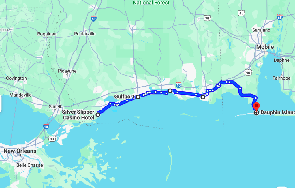 That stretch of US-90 in far eastern Louisiana between the Slidell area and Waveband MS had a hex on it. We would start this new ride in Waveland MS, our original day’s destination from two years earlier. Waveband and the Silver Slip Casino are the westernmost points of the Mississippi Gulf Coast, about ten miles from the Louisiana line. This is the bike ride we took in 2024.