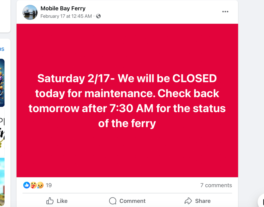 We broke out the whiskey and enjoyed the view and celebrated our nearly fifty mile ride. I checked status on the Fort Morgan Ferry’s Facebook page. It was not good news. It felt very Third World. What would we do now?