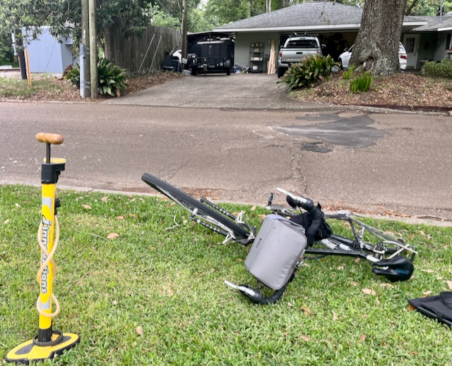 I sat on a golf course bench and took my rear wheel off so I could change the tube. I had intended to use my small portable pump. Across the street out of someone’s garage a guy and I presume his wife had been watching me. He walked up and handed me his full size pump. He clearly had bicycled enough to know that having such a pump makes the process smoother. What a nice guy! He just asked that I leave the pump in the garage when I was done.