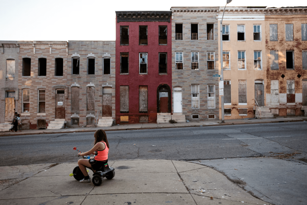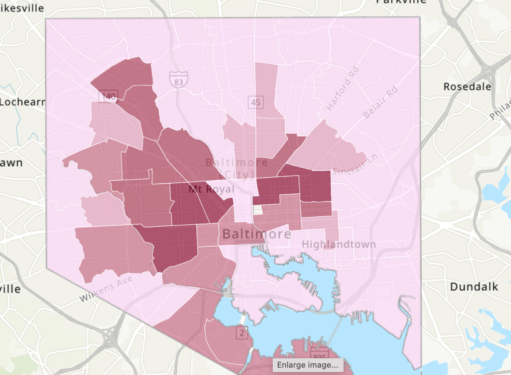 A Federal Reserve website has a map indicating in dark the highest level of abandoned housing. Federal Hill is the light colored peninsula at the bottom center. The next day I would be cycling to the industrial area on the lower right. The Aisle of Denial is the lightly colored area spreading north from downtown. The top of that area, around the I-83 sign, is Johns Hopkins University. Most rich people’s houses are further north of that.